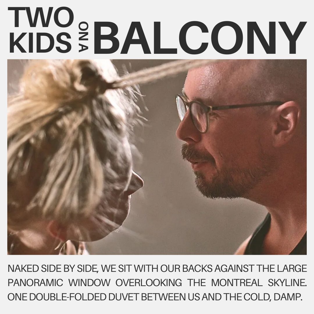 Naked side by side, we sit with our backs against the large panoramic window overlooking the Montreal skyline. One double-folded duvet between us and the cold, damp concrete balcony, the other wrapped around us. It’s our picnic together. We drink fruity white wine, eat green olives and spit the kernels over the railing. Countless windows in the high-rise building opposite cast their warm homely light back to us, and in each window, a theatre in miniature takes place. A mother cooks dinner for her daughter, who watches television in the window next door. A man waters his flowers, and he looks happy. A lady sleeps in her favourite chair with a beaten-up book on her lap. Together they each contribute a small piece of the puzzle in the glittering skyline of the big city.